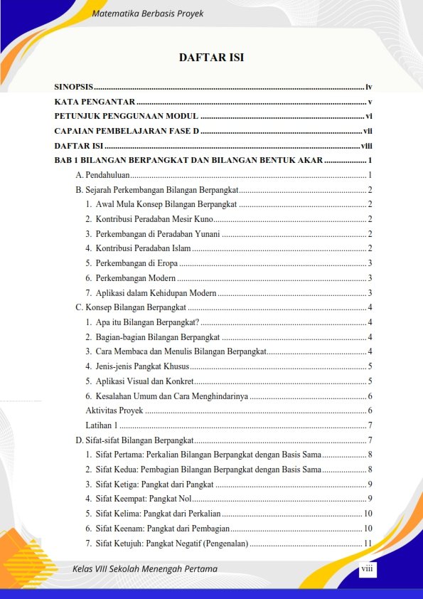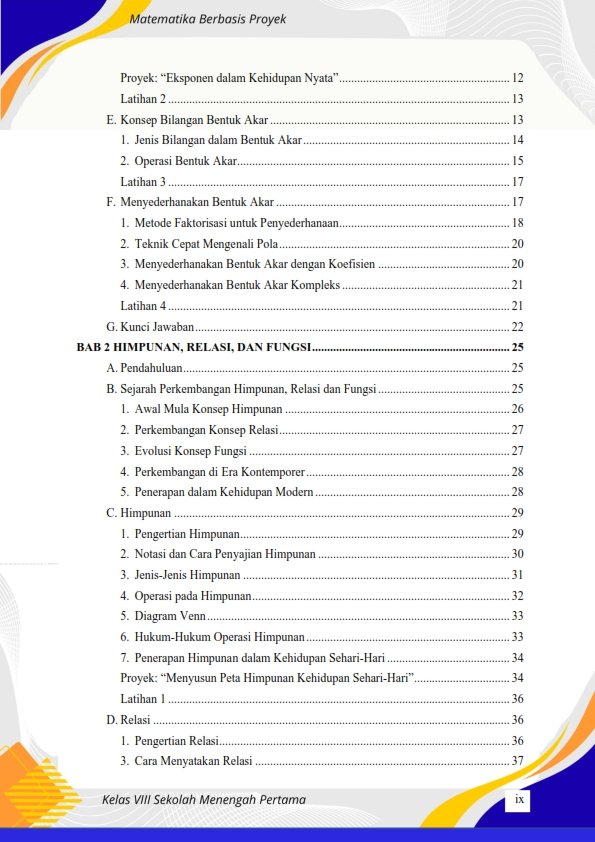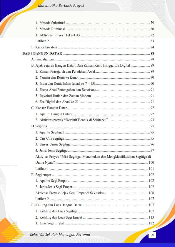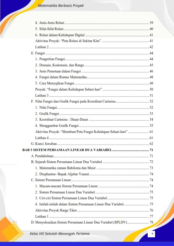 Buku “Belajar Matematika Berbasis Proyek untuk SMP Kelas VIII” ini dirancang sebagai panduan pembelajaran matematika yang komprehensif, yang mengutamakan pendekatan berbasis proyek untuk siswa kelas VIII SMP. Buku ini menggabungkan teori matematika dengan penerapannya dalam kehidupan sehari-hari, serta menyediakan contoh soal, latihan, dan kegiatan yang dapat membantu siswa dalam mengasah kreativitas dan keterampilan berpikir kritis.