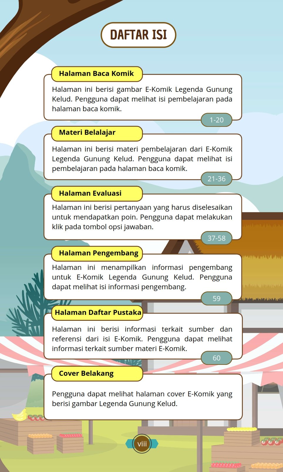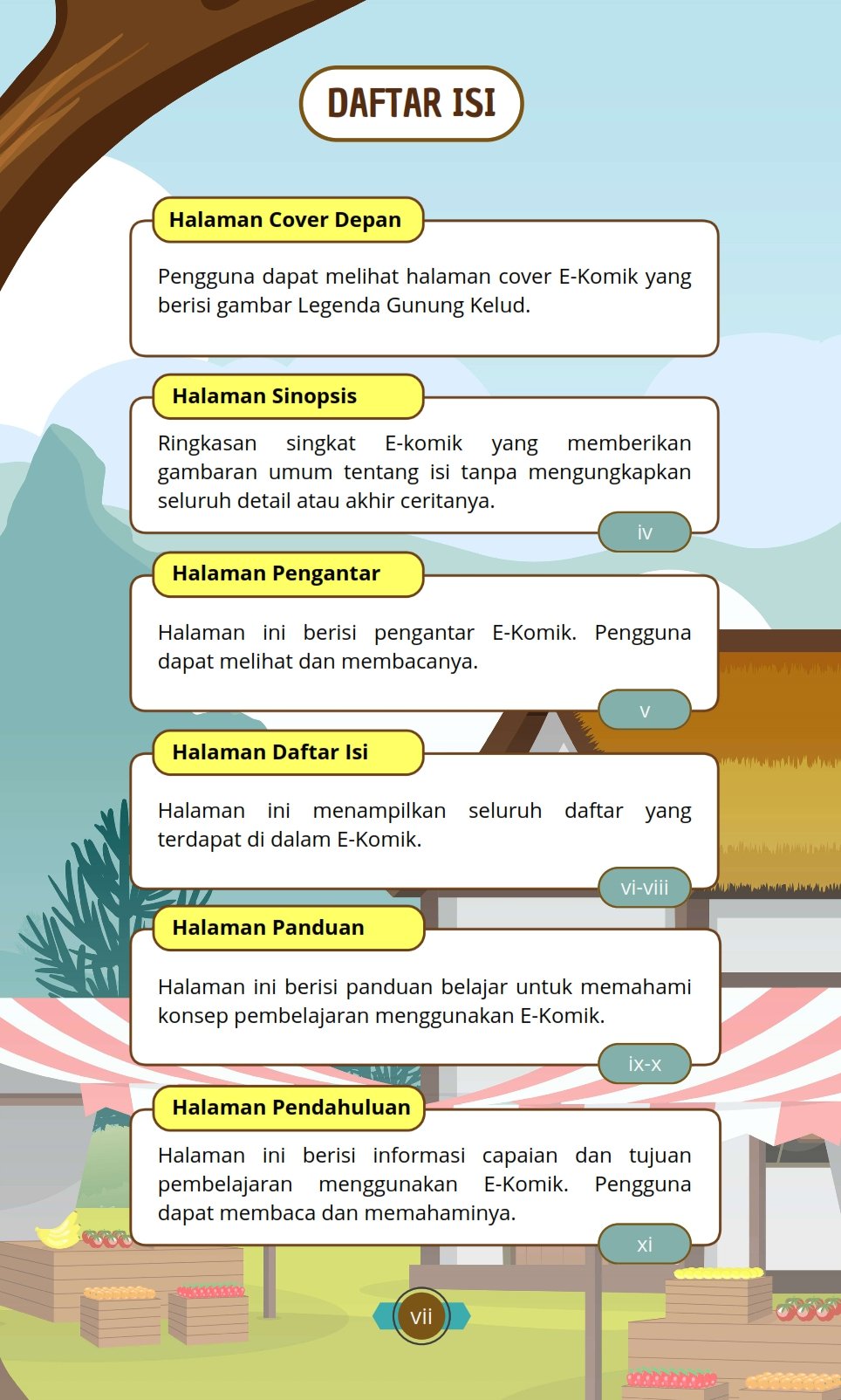Setiap tema dilengkapi dengan berbagai aktivitas reflektif, diskusi, latihan soal, dan evaluasi yang dapat dilakukan baik secara individu maupun kelompok. Selain itu, pengguna juga akan mendapatkan pengalaman belajar yang lebih mendalam melalui ilustrasi menarik dan skenario pembelajaran yang interaktif.Melalui E-Komik ini, pembaca tidak hanya mendapatkan pemahaman baru tentang budaya dan nilai-nilai lokal, tetapi juga dibimbing untuk mengaplikasikan pengetahuan tersebut dalam kehidupan sehari-hari. Selamat belajar dan temukan kearifan lokal yang berharga dari Gunung Kelud!