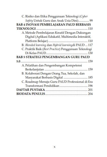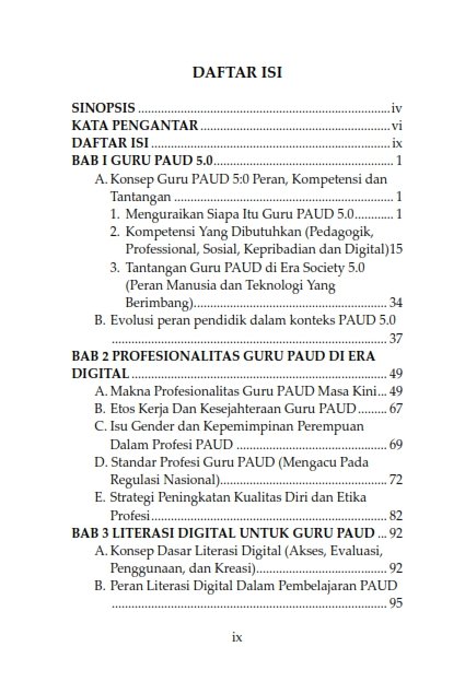 Buku ini juga mengupas pentingnya literasi digital sebagai kompetensi utama bagi guru PAUD, yang tidak hanya meliputi kemampuan mengoperasikan teknologi, tetapi juga memahami dan memilih informasi digital dengan bijaksana, mengelola keamanan digital, serta menciptakan karya kreatif yang mendukung proses belajar mengajar. Melalui kajian teoritis dan praktik baik, buku ini menggambarkan bagaimana guru PAUD dapat bertransformasi menjadi pendidik 5.0 yang kreatif, adaptif, dan bertanggung jawab. Penulis berharap buku ini dapat menjadi referensi penting bagi para pendidik, mahasiswa, peneliti, dan pengelola PAUD dalam membangun kurikulum dan kebijakan yang mendukung kesiapan guru dalam menghadapi era digital, serta memperkuat peran guru dalam mendidik generasi masa depan yang kreatif dan berbudi pekerti luhur.