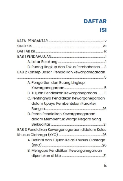 Buku “ Pendidikan Kewarganegaraan di Kelas KKO” ini menyajikan kajian mendalam mengenai pentingnya integrasi pendidikan kewarganegaraan dalam Kelas Khusus Olahraga (KKO). Buku ini bertujuan untuk memberikan pemahaman tentang bagaimana pendidikan kewarganegaraan dapat diterapkan secara efektif dalam konteks olahraga, serta bagaimana hal itu berkontribusi pada pembentukan karakter siswa yang tidak hanya unggul dalam olahraga, tetapi juga memiliki sikap dan nilai kewarganegaraan yang baik.