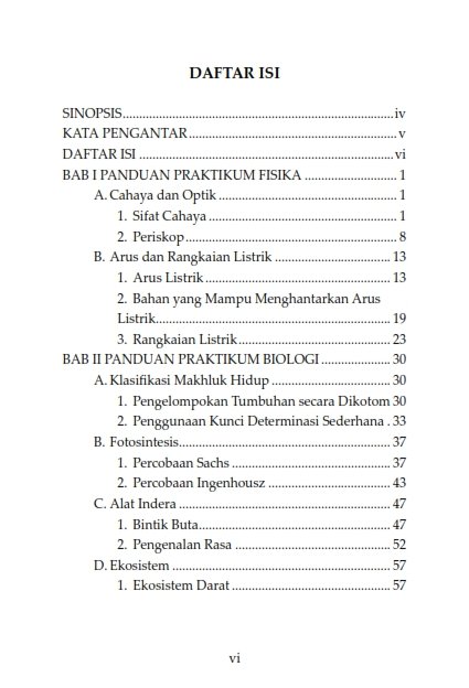 Isi buku terbagi ke dalam dua bidang utama, yaitu praktikum fisika dan praktikum biologi. Pada bagian fisika, mahasiswa diajak melakukan percobaan sederhana mengenai cahaya, optik, serta arus listrik dan rangkaian listrik. Sementara itu, pada bagian biologi disajikan petunjuk praktikum yang mencakup klasifikasi makhluk hidup, fotosintesis, alat indera manusia, dan ekosistem.