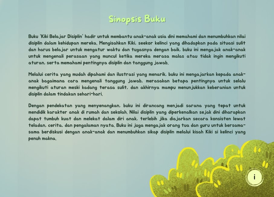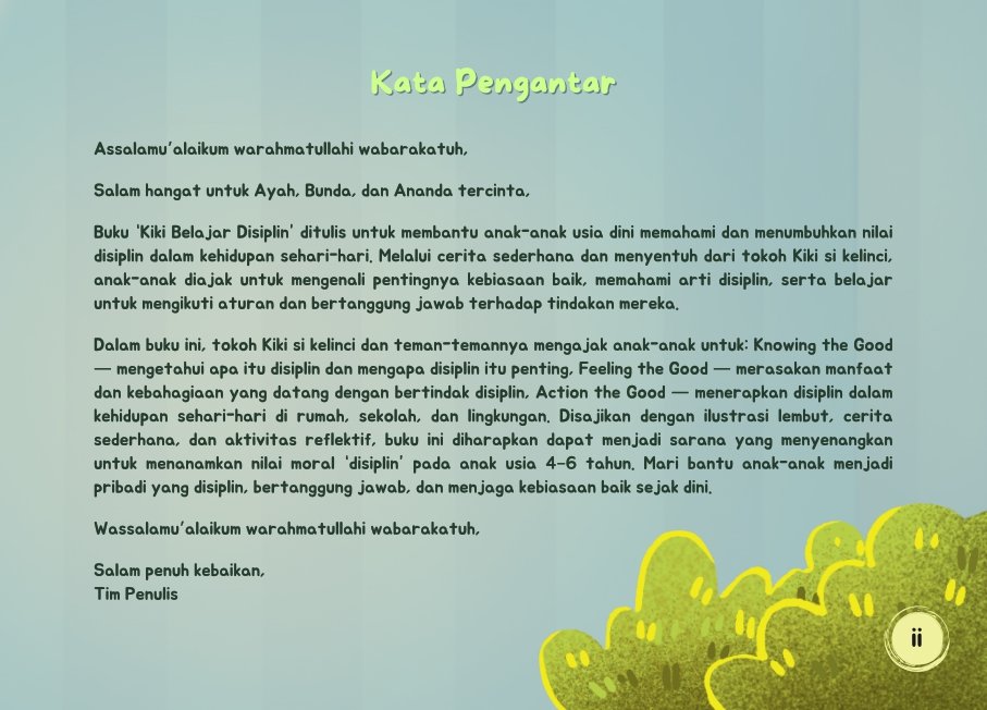 Dengan pendekatan yang menyenangkan, buku ini dirancang menjadi sarana yang tepat untuk mendidik karakter anak di rumah dan sekolah. Nilai disiplin yang ditanamkan sejak dini diharapkan dapat tumbuh kuat dan melekat dalam diri anak, terutama jika diajarkan secara konsisten melalui teladan, cerita, dan pengalaman nyata. Buku ini juga mengajak orang tua dan guru untuk bersama-sama berdiskusi dengan anak-anak dan menumbuhkan sikap disiplin melalui kisah Kiki si kelinci yang penuh makna.