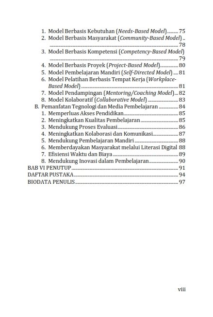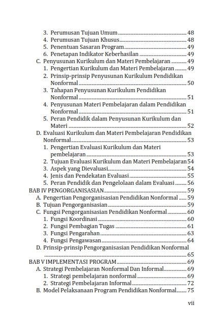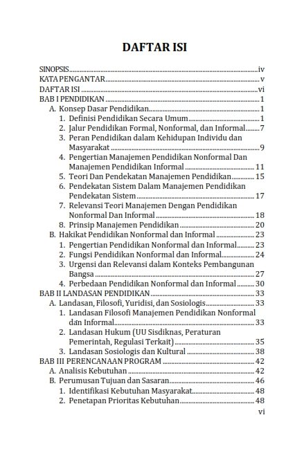 Selain itu, buku ini menekankan pentingnya manajemen pendidikan nonformal dan informal dalam menghadapi perubahan sosial, budaya, dan perkembangan teknologi yang cepat. Melalui pembahasan yang komprehensif dan aplikatif, penulis menunjukkan bagaimana pengelolaan yang profesional dapat meningkatkan kualitas layanan pendidikan, memberdayakan masyarakat, serta membentuk individu yang mandiri, berkarakter, dan adaptif terhadap tantangan zaman. Dengan landasan teoritis yang kuat dan relevan dengan praktik lapangan, buku ini diharapkan menjadi referensi penting bagi pelajar, pendidik, pengelola lembaga pendidikan, dan pemangku kepentingan dalam mengembangkan pendidikan nonformal dan informal secara optimal.
