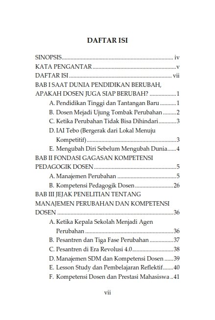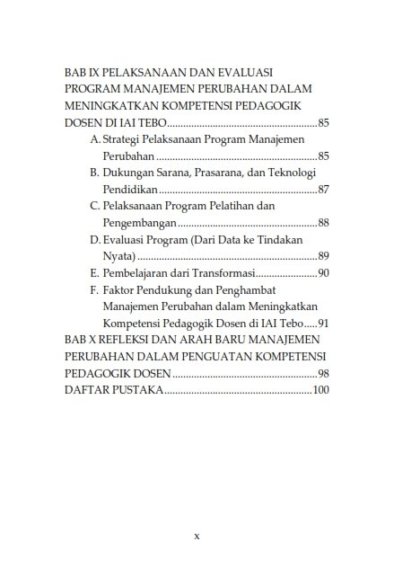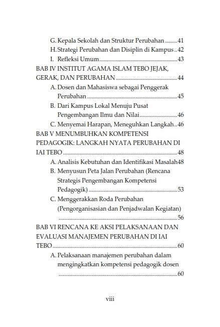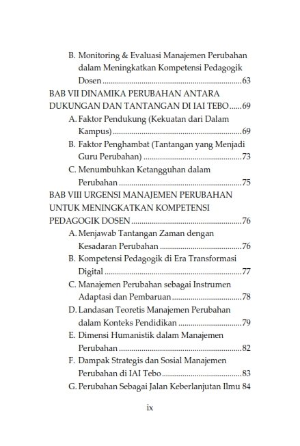 Buku ini juga mengangkat pentingnya kompetensi pedagogik dosen sebagai fondasi dalam melaksanakan perubahan. Pembaca akan diajak untuk menggali lebih dalam tentang bagaimana dosen perlu mengembangkan keterampilan pedagogik mereka, seperti perencanaan pembelajaran, penggunaan teknologi dalam pendidikan, dan evaluasi hasil belajar, untuk menciptakan pembelajaran yang lebih efektif dan bermakna. Melalui contoh konkret dari IAI Tebo, buku ini memberikan wawasan tentang bagaimana manajemen perubahan yang sistematis dapat meningkatkan kualitas pembelajaran dan membawa dampak positif dalam pengembangan institusi pendidikan tinggi di era transformasi pendidikan global.