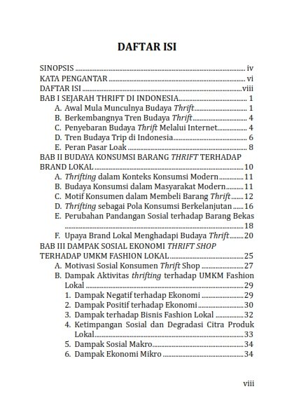 Buku ” Strategi Manajemen Resiko Brand Lokal Menghadapi Tren Thrift ” memberikan edukasi kepada pembaca mulai dari sejarah, perkembangan bisnis Thrift dan juga pola konsumsi masyarakat Indonesia terhadap jenis produk thrift serta tantanganya bagi pelaku usaha fashion lokal. Pergeseran pandangan sosial menjadikan pakaian hemat sebagai simbol kreativitas dan gaya hidup sadar lingkungan, meskipun tren ini juga menghadirkan tantangan bagi brand fashion lokal dalam menjaga daya saing dan loyalitas konsumen.