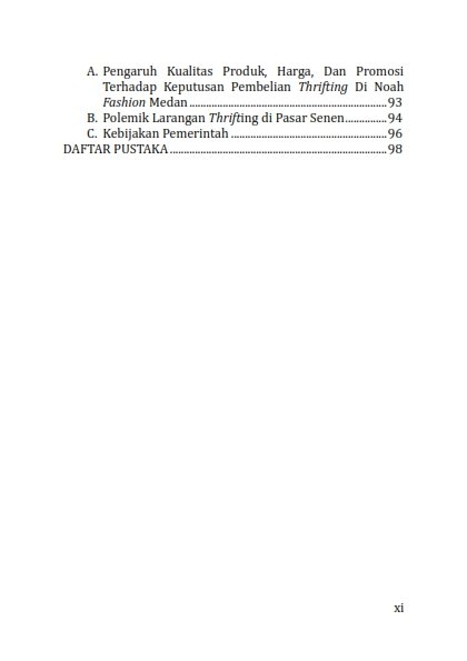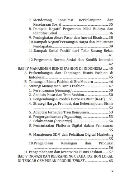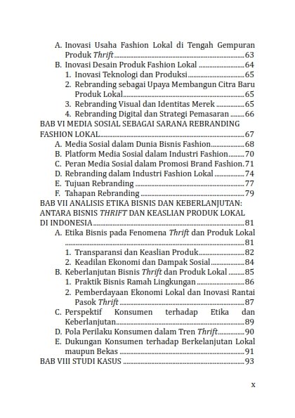 Kehadiran buku ini diharapkan dapat memberikan informasi bagi pelaku usaha fashion lokal bagaiama seharusnya strategi manajemen bisnis, inovasi, dan rebranding yang adaptif bagi brand fashion lokal agar mampu bertahan dan berkembang di tengah gempuran budaya thrift . Pemanfaatan media sosial, penguatan identitas merek, penerapan prinsip kemiskinan, serta penerapan etika bisnis menjadi langkah penting dalam membangun kepercayaan dan melestarikan konsumen. Selain itu, sinergi antara pelaku usaha, pemerintah, dan konsumen sangat diperlukan untuk menciptakan ekosistem fesyen yang adil, berkelanjutan, dan berorientasi pada penguatan produk lokal. Dengan pendekatan tersebut, tren thrift ing tidak hanya menjadi tantangan, tetapi juga dapat dimanfaatkan sebagai peluang untuk mendorong transformasi positif industri fashion lokal Indonesia.
